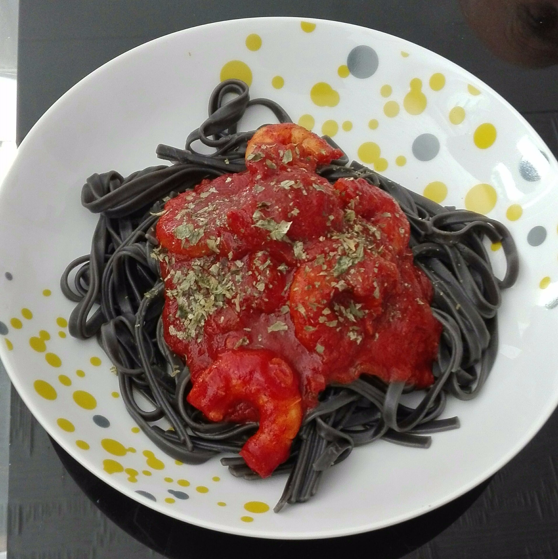 Spaghettis à l'encre de seiche & aux crevettes