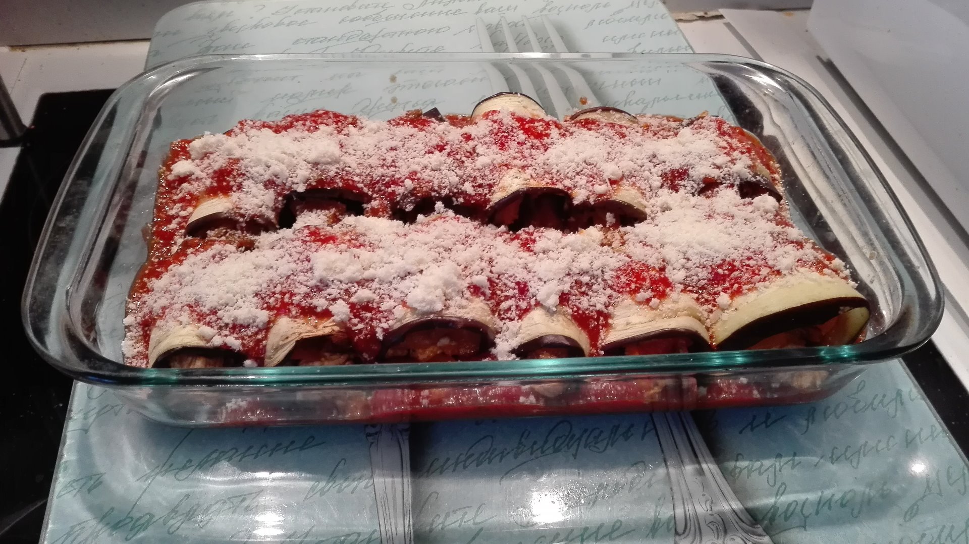 une fois les aubergine refroidi et la préparation aussi, dans un plat déposé un peut de coulis puis formez vos rouleau d'aubergine farci de la farce et les déposer sur le coulis, recouvrir du reste de couli et parsemer de parmesan